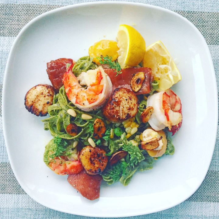 One can never go wrong with pasta. Especially when it’s topped with massive prawns, candied wild sockeye salmon and glazed scallops.